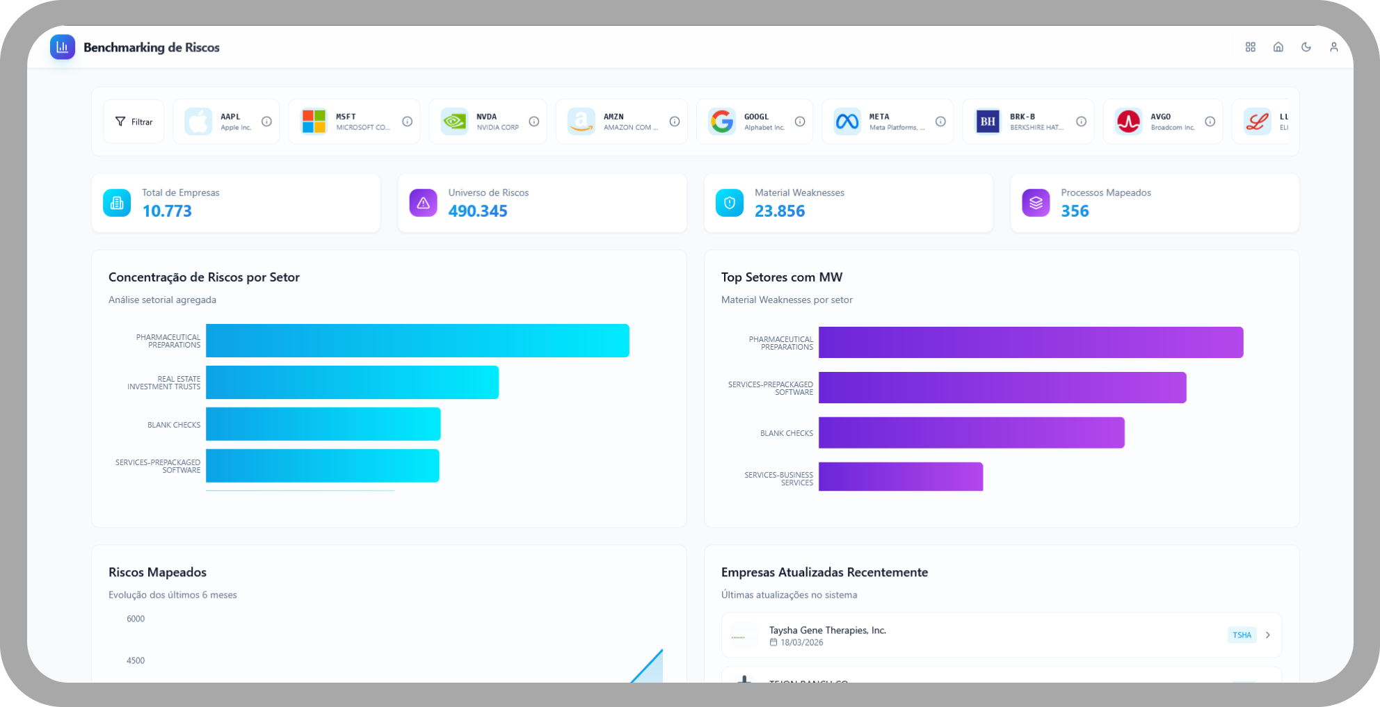 Um catálogo de riscos para processos de negócio de todos os segmentos. Inclusive o seu. Integrado ao banco de relatórios de risco do Governo Americano, o benchmarking extrai e resume os principais riscos listados pelos maiores players do mercado global.